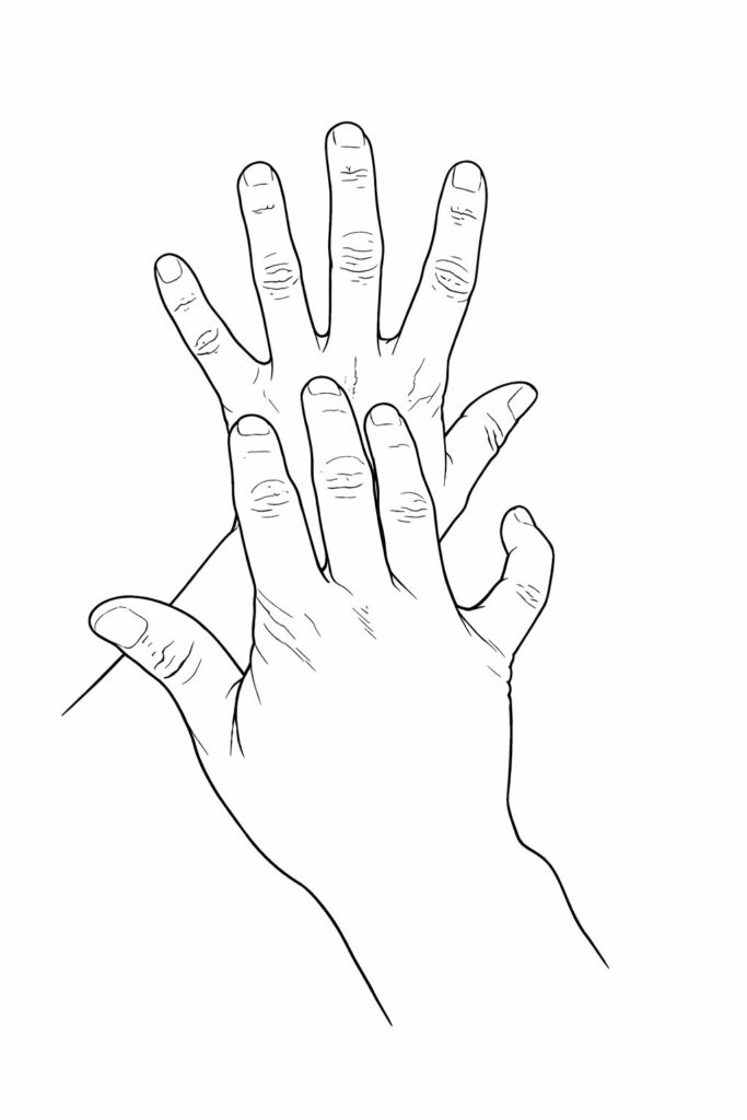 その後、側面をつまむようにして根元から指先までさすります。手の甲のマッサージはは片手を反対の手の甲に添え指と指の間から手首に向けてさすります。(画像参照)